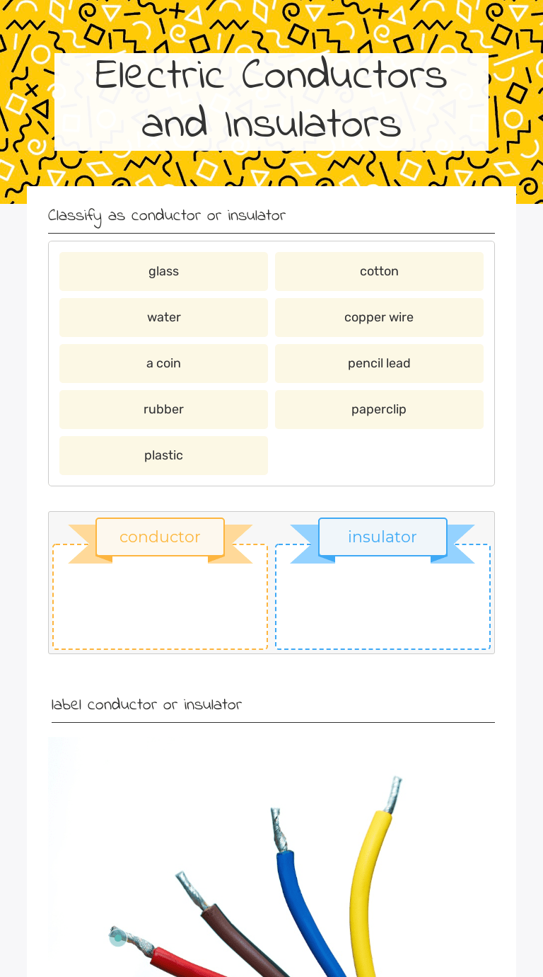 A worksheet that explores conductors and insulators. You could also use this conductors and insulators . From insulators and conductors worksheets to conductors insulators heat videos, . Can you think of other conductors? Water is a good conductor of electricity. Use the fun conductors and insulators worksheet to keep your students engaged. Power lines are made to conduct electricity efficiently and . Record them on your worksheet. Student resource guide and student. Find conductors and insulators lesson plans and teaching resources. Live worksheets > english > science > energy > conductors and insulators . Sort the objects into conductors or insulators. You can do the exercises online or download the worksheet as pdf.
